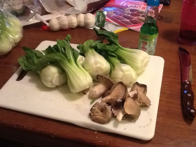 On the upside my lack of sleeping ability is great for my blogging. When I went to the Asian market I picked up some interesting things for dinner. I got bok choy and garlic to make my favorite recipe and this time I actually added in some of those amazing oyster mushrooms that I bought. (looking for my bok choy recipe? Click on the recipes tag at the end of this post and look back a few posts, it's super yummy) Essentially you slice up the bok choy, garlic, and mushrooms, then sauté them in olive oil and soy sauce.